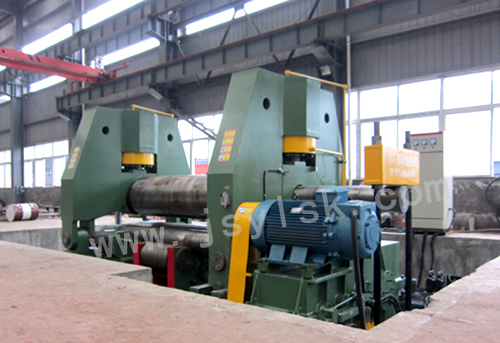 卷板機(jī)上輥在兩下輥中央對稱位置通過液壓缸內(nèi)的液壓油作用于活塞作垂直升降運動,通過主減速機(jī)的末級齒輪帶動兩下輥齒輪嚙合作旋轉(zhuǎn)運動,為卷制板材提供扭矩。卷板機(jī)規(guī)格平整的塑性金屬板通過卷板機(jī)的三根工作輥(二根下輥、一根上輥)之間,借助上輥的下壓及下輥的旋轉(zhuǎn)運動,使金屬板經(jīng)過多道次連續(xù)彎曲,產(chǎn)生永久性的塑性變形,卷制成所需要的園筒、錐筒或它們的一部分。該液壓式三輥卷板機(jī)缺點是板材端部需借助其它設(shè)備進(jìn)行預(yù)彎。該卷板機(jī)適用于卷板厚度在50mm以上的